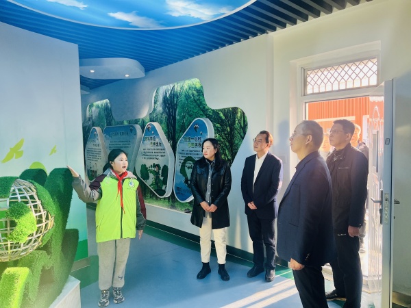 调研组一行首先观摩了学校垃圾分类现场,了解学校分类垃圾桶设置、垃圾分类投放以及引导监督情况。随后参观了环保宣传墙,了解学校垃圾分类氛围营造、理念宣传,以及家长课堂、校园领养、校外植绿、社区义工、社会调研等专题实践活动开展情况。调研组一行一边观看一边听取校长余秀萍关于学校垃圾分类工作开展和废旧物品循环利用情况的介绍。