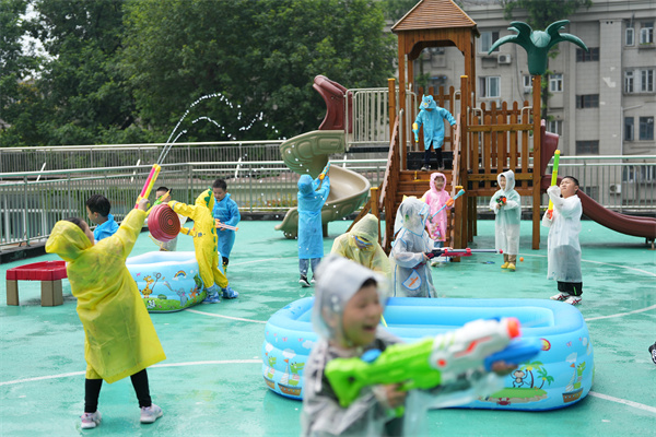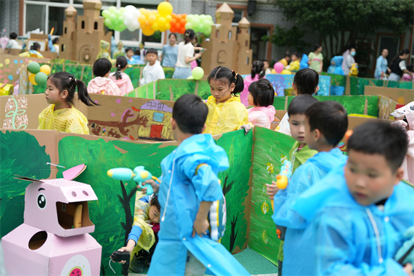 活动现场,孩子们身着色彩缤纷的夏装,迫不及待地投入到各个游艺体验区,尽情享受着夏日的美好时光。在炫彩一“夏”区域,孩子们参与彩虹瀑布、颜色蹦蹦跳、“膜”法夏日等趣味游戏,用热情与乐趣在画布上尽情挥洒创意;探秘一“夏”区域是一个充满挑战和乐趣的探险乐园,孩子们可以参加走迷宫、蜘蛛捕食、蚂蚁搬豆、虫虫运动会等集互动性与挑战性为一体趣味游戏;香甜一“夏”区域则是一个美食的天堂,孩子们可以品尝食堂大厨精心制作的桂花糖芋苗、鸭血粉丝汤、卤鹌鹑蛋、葱油烧饼等南京特色小吃,感受传统美食文化的魅力;在清凉一“夏”区域,孩子们纷纷化身成勇敢的小战士,不畏“枪林弹雨”向前冲,当水滴、水柱淋落在每一个小朋友的身上,尖叫声、欢呼声、呐喊声此起彼伏,幼儿园变成了欢乐的海洋。