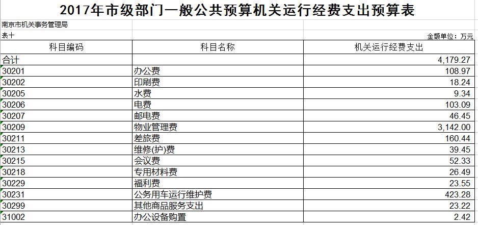 2017年机关运行经费4179.27万元,其中:办公经费108.97万元,印刷费18.24万元,水费9.34万元,电费103.09万元,邮电费46.45万元,差旅费160.44万元,维修(护)费39.45万元,会议费52.33万元,专用材料费26.49万元,福利费23.55万元,公务用车运行维护费423.28万元,其他商品服务支出23.22万元办公设备购置2.42万元,物业费3142万元(包括局机关公共绿化费110万元,市级机关物业管理服务中心(市级机关房产管理中心)物业费3032万元)。